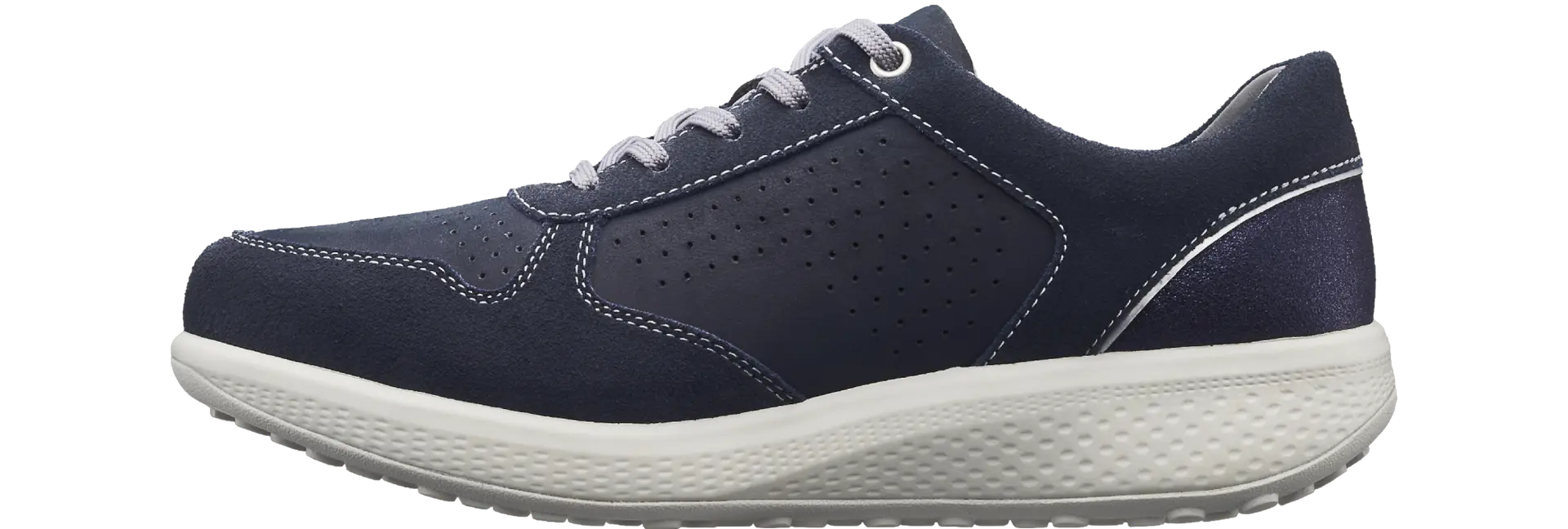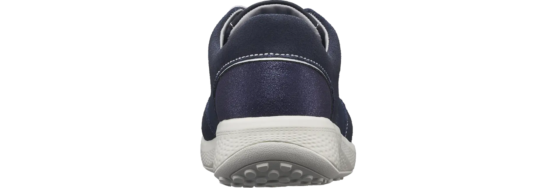 - Obermaterial: Kombination aus perforiertem dunkelblauem Nubuk-Leder, mit blauem Velours-Leder und dezent glitzernder Fersenpartie